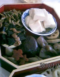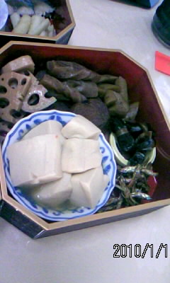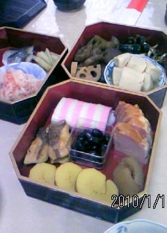 これが元旦の朝のお節料理。でも、まだ完全な姿じゃない。