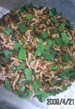 あとは、3つで98円の玉ねぎと、乾物コーナーで白胡麻のすり胡麻90g134円、おやつ用に半額シールがついて44円になっていた柏餅(よもぎ)も、2つ、買ってきた。