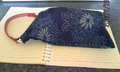 手芸用品のコーナーでは、2サイズのバネ口金と赤い牛革の携帯ケース用ハンドル、透明のミシン糸、古布柄を再生させた35×50のカットクロスが1枚。