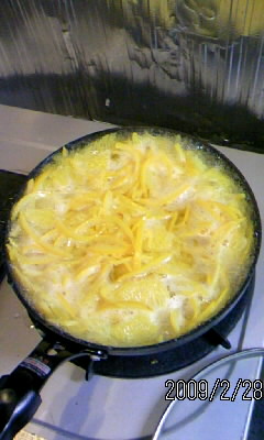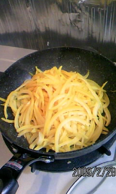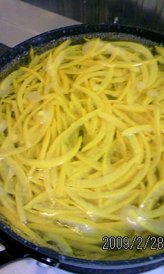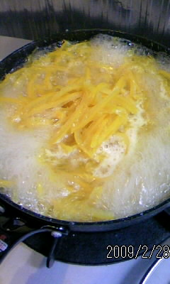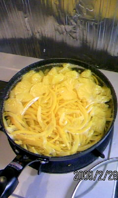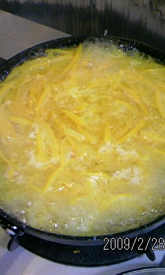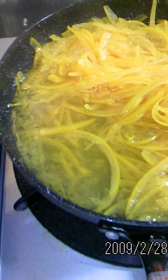せん切りにした八朔の皮は、鍋やフライパンへ。