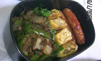 ごちゃごちゃっとしているのは、ピーマン1個と玉ねぎ少量を炒め、作り置きをして冷凍しておいた肉味噌に絡めたもの。