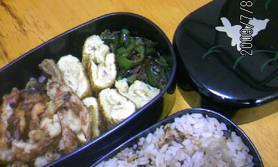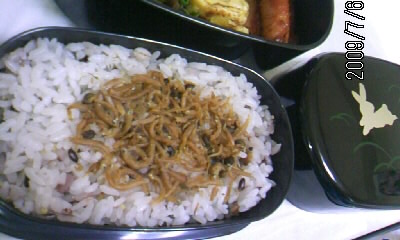 お弁当のごはんは、十五穀入り。自家製ちりめん山椒をのせておいた。